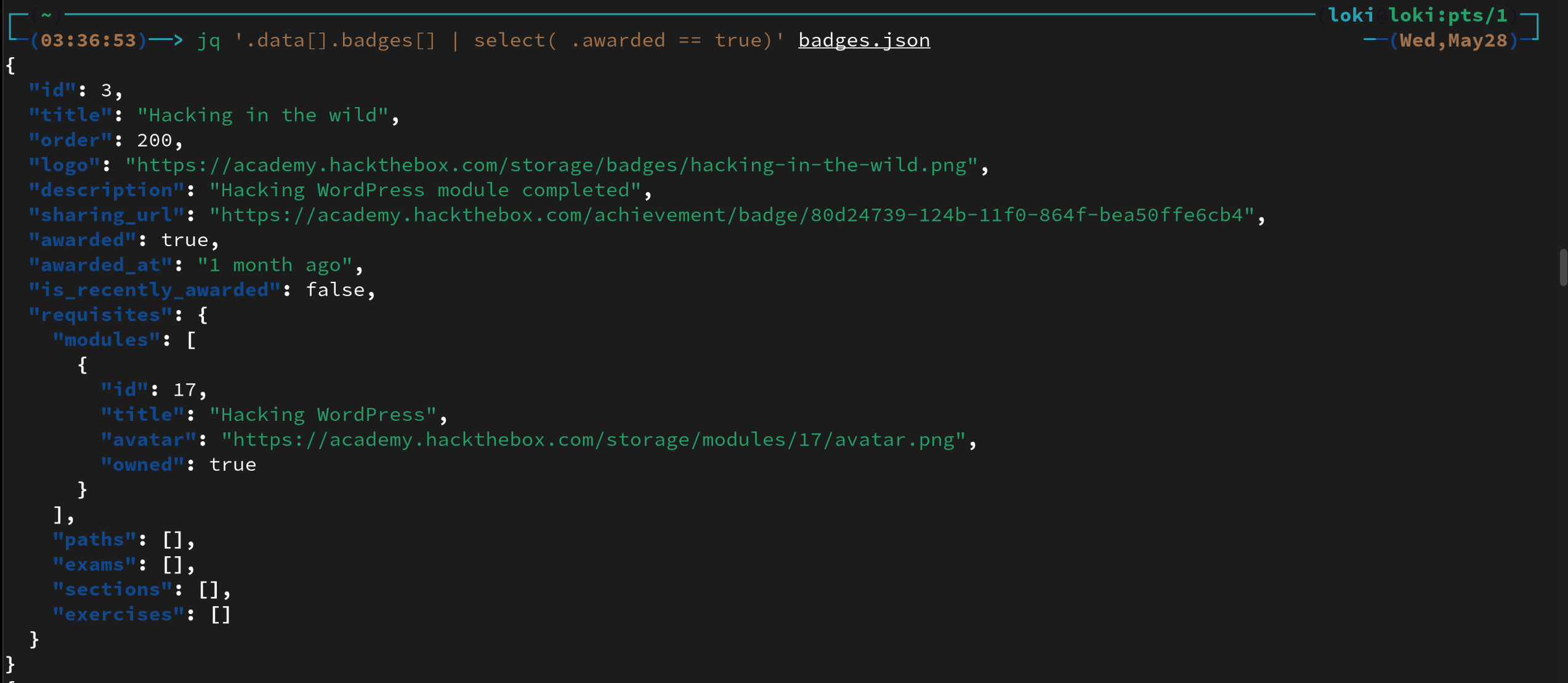 I copied this information to a file named badges.json on my system and ran the following command to extract awarded badges.