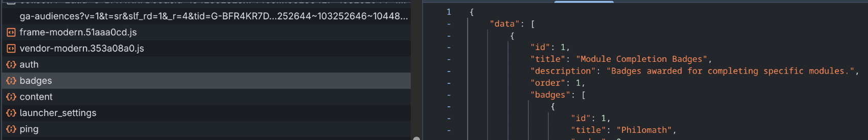 As we can see, the application makes an API call to a ‘badges’ endpoint to get the full list of badges available. I just copied this information as I’m not interested in automating the full flow, but I imagine that there is a way to fetch this information on the fly.